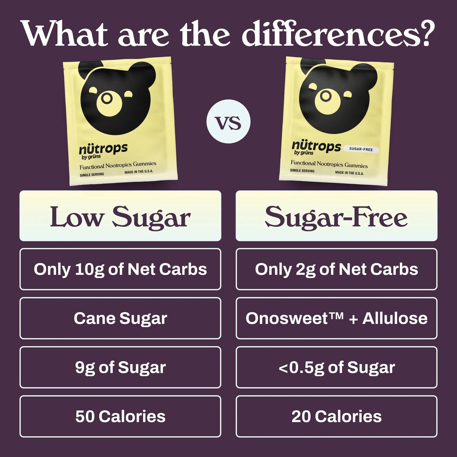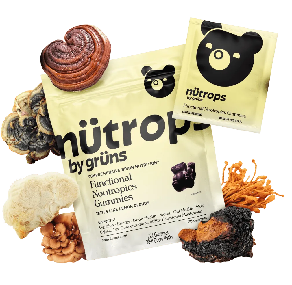 The 6 organic fruiting body mushrooms in Nütrops provide comprehensive brain health - both short-term cognition and long-term brain health benefits. Benefits include cognition, energy, brain health, mood, sleep, and gut health.