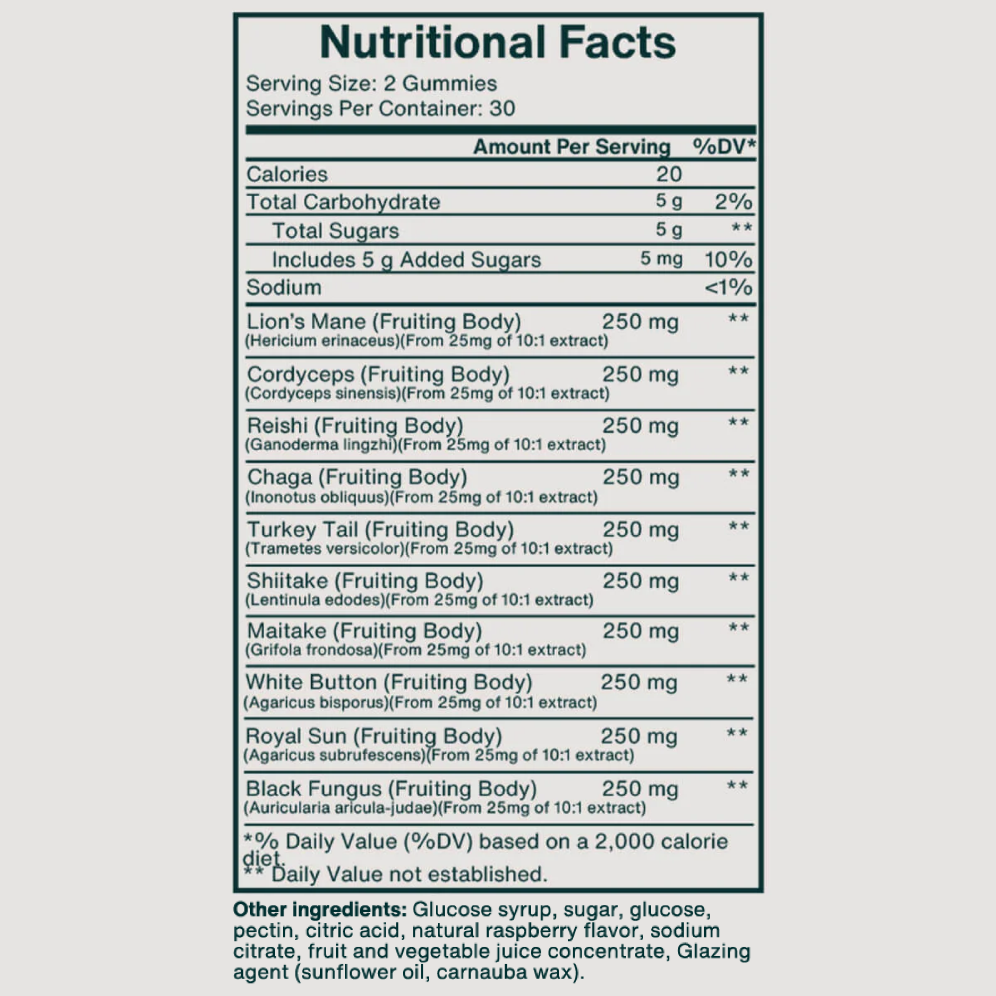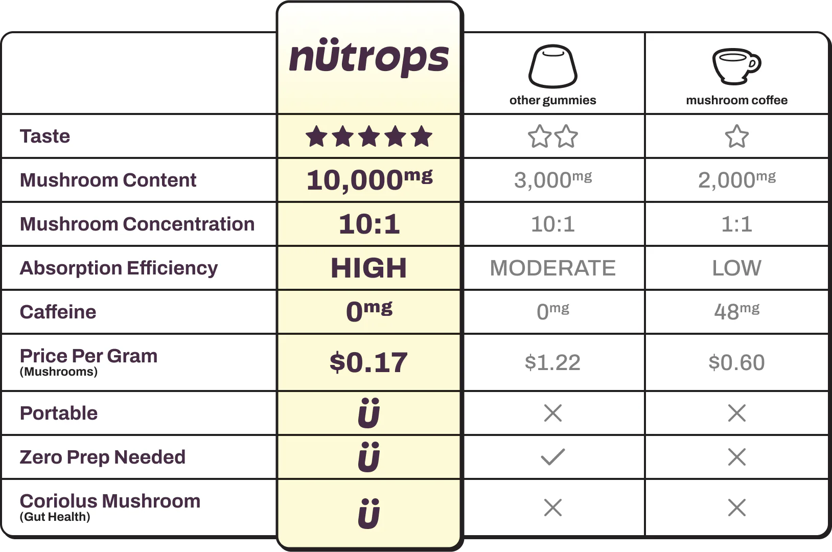 Nütrops is made with a 1,000mg of 10:1 concentrations of organic mushroom fruiting body extract, meaning it takes 10,000mg of fruiting body mushrooms to make every serving of Nütrops. For every 10 parts of raw fruiting body mushroom, 1 part of the most potent, bioactive compounds is extracted. This ensures that our formulation delivers a powerful dose of beneficial nutrients and compounds, without requiring large quantities of mushroom powder to be consumed.